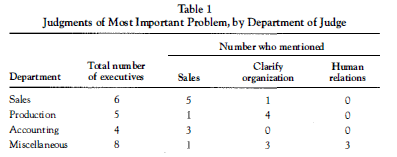 Since the statements these executives wrote are relatively brief, they are reproduced in full in the appendix to this chapter. We tested our hypothesis by determining whether there was a significant relation between the “most important problem” mentioned and the departmental affiliation of the mentioner. In the cases of executives who cited more than one problem, we counted all those they listed. We compared (1) the executives who mentioned “sales,” “marketing,” or “distribution” with those who did not; (2) the executives who mentioned “clarifying the organization” or some equivalent with those who did not; (3) the executives who mentioned “human relations,” “employee relations,” or “team work” with those who did not. The findings are summarized in Table 1.