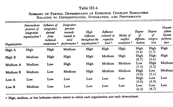 While we could speculate on this and other relationships, as well as on which conditions had the greatest effect on decision- making behavior, it does not seem fruitful to do so with the data available. Rather, we have summarized these data so that the total configuration of determinants can be visually compared among organizations. From this comparison it is clear that in the two high-performing organizations there were more conditions that would lead to effective resolution of interdepartmental conflict. This overall finding provides an important explanation of how these two organizations managed to attain both high differentiation and integration, even though the two states were essentially antagonistic. Managers in these organizations were apparently able to deal effectively with conflict. In spite of their widely different ways of thinking and behavior patterns which enabled them to perform their specialized tasks, managers were able to reach decisions that provided effective collaboration.