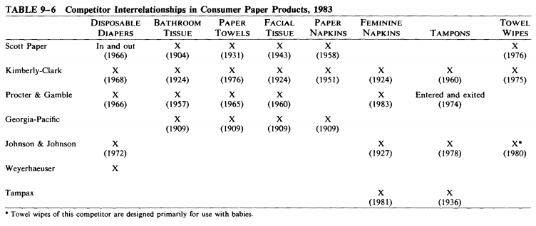 In consumer paper products, for example, there has been a great deal of offensive and defensive diversification. Table 9-6 shows the dates of entry of each competitor into the respective industries. Competitors’ portfolios of businesses have broadened since the late 1950s. Procter & Gamble’s actions triggered this sequence of moves. P&G began in toilet tissue and then moved into facial tissue, disposable diapers, and paper towels defensively.