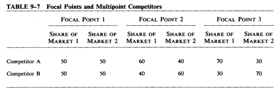 Table 9-7 illustrates this. Here focal points 2 and 3 will tend to be more stable than focal point 1. In each industry, the high-share competitor will tend to have a clear competitive advantage, and hence a small disturbance will be less likely to cause either firm to precipitate a war. Similarly, the asymmetry of positions reduces the chances that the high-share competitor in one industry will seek an even greater share, since it remains vulnerable to retaliation in the industry in which it is weak.