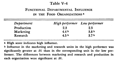 Turning to the determinants affecting the ability of all the members of the organization to handle conflict effectively, we shall first examine the relative influence of the basic departments in each organization. In both organizations we found that the marketing and research groups had significantly higher influence than production (Table V—4). This was consistent with the dominant issue of innovation, which required that the inputs from the market and scientific sectors be combined to develop successful new products. In the high-performing organization, however, members of both of these units had significantly higher influence than their opposite numbers in the competing organization.