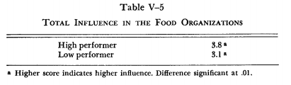 Thus it is not surprising that the total influence in the high- performing organization was significantly higher than in the low-performing organization (Table V-5). To interpret this difference in total influence properly, we must first examine another factor that affected their relative capacity for dealing with interdepartmental disputes.