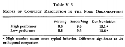 Once more the final determinant of effective conflict resolution that we shall examine is the typical mode of behavior used to resolve conflict. Confrontation was more typical in the low- performing organization than in the more successful one (Table V-6). In the other modes of handling conflict the two organizations were similar. Although confrontation was more typical in the low performer, the high-performing organization was doing as much confronting and problem solving as the most effective plastics and container organizations. Since both food organizations compared favorably with all the other organizations in the study, this suggests that the reliance on confrontation should have facilitated the resolution of conflict in both organizations.