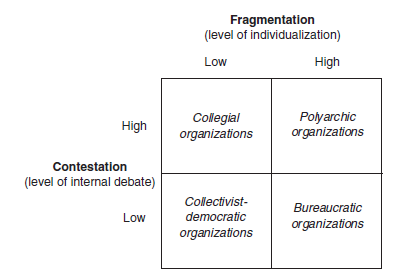 We suggest placing the polyarchic model into discrete categories to help situate it with respect to the other political structures we have outlined in Table 11.2. These categories are dependent both on the level of fragmentation of the organizational body (political plurality) and on the level of admissible contestation (deliberative culture. The discussion is summarized in Figure 11.3.
