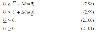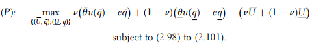 Following procedures similar to what we have done so far, only (2.104) and (2.105) are binding constraints. Finally, we find that the high valuation agent receives the first-best quality q¯SB = q¯* where θ¯ = C’(q¯*). However, quality is now reduced below the first-best for the low valuation agent. We have qSB < q∗, where