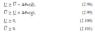The analysis is the mirror image of that of section 2.5, where now the efficient type is the one with the highest valuation for the good θ¯. Hence, (2.99) and (2.100) are the two binding constraints. As a result, there is no output distortion with respect to the first-best outcome for the high valuation type and