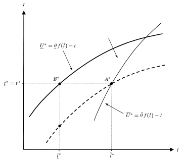 The indifference curves of the firm are concave in the (l, t) space with higher levels of utility obtained as one moves towards the southeast. The θ¯-indifference curve has a greater slope than the θ-one so that the single crossing property still holds in our context.