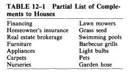 In view of the potential importance of complements both to a firm’s competitive position and to industry structure, a firm must be aware of what products are complements to its product. The identifica tion of complements is sometimes subtle, and often complements can be uncovered that are not generally perceived as such. Most industries will have a rather long list of products that are complementary to some degree. Table 12-1 gives an illustrative (and partial) list of prod-ucts that are at least somewhat complementary to residential home building.