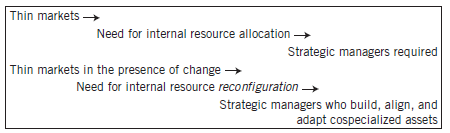 In short, fuzzy property rights (as with intangibles), appropriabil- ity issues, and cospecialization are among the reasons why asset markets can be thin. This renders market transactions difficult. Whenever this occurs, managers have a distinctive role that differs from the role of traders and arbitrageurs. (See Figure 2.1.)