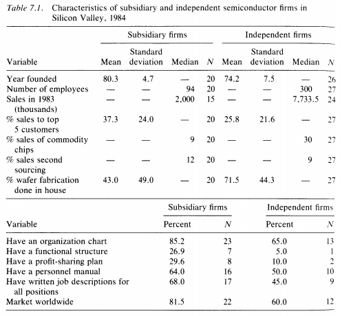 In general, we believe subsidiaries are better protected from life-threatening disruption stemming from resource scarcity or temporal variations in resources. Because they are parts of bigger corporations that are usually less driven by technology than semiconductor firms, we expect subsidiaries to be more bureaucratic. Fortunately, we have detailed data on a subsample of semiconductor firms which we can use to describe the difference between these two forms in more detail.