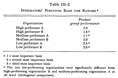 Integrators in these four organizations were apparently getting either explicit or implicit signals from their superiors that a relatively important part of their job was to contribute to the overall performance of the products for which they were responsible. In the low-performing organizations this particular incentive to work at the resolution of conflict was not so noticeable, which may have contributed to the difficulties these organizations encountered in achieving the required state of differentiation and integration.
