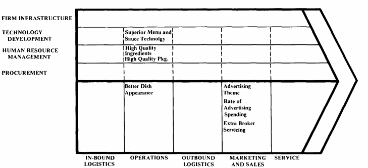 A firm’s overall level of differentiation is the cumulative value it creates for buyers in meeting all purchase criteria. The sources of differentiation in the firm’s value chain are often multiple, as illustrated by Stouffer’s successful differentiation strategy in frozen entrees (Figure 4-7). Stouffer’s has differentiated itself in both use and signaling criteria. Heavy spending on menu development has led to Stouffer’s having the highest proportion of unique dishes, as well as superior sauce technology. Care in ingredient selection and preparation has resulted in dishes of attractive, consistent appearance. Meals are more sophisticated in their menus and ingredients. Stouffer’s attractive packaging serves as a signal of value, reinforcing its quality image. Stouffer’s also pioneered high rates of spending on advertising in a product category where low spending levels had been the norm. It also innovated by advertising its frozen entrees as gourmet meals for busy people rather than as quick, filling meals for the family. Finally, Stouffer’s spends a considerable amount on a direct sales force and food brokers in order to gain attractive retail shelf displays, rapid restocking, and the removal of damaged merchandise. These multiple sources of uniqueness in its value chain combine to yield Stouffer’s a significant price premium over its competitors. Differentiation has also led to a substantial market share.