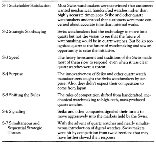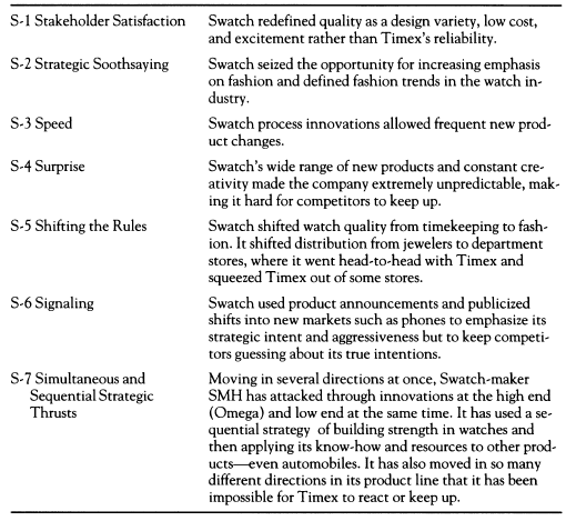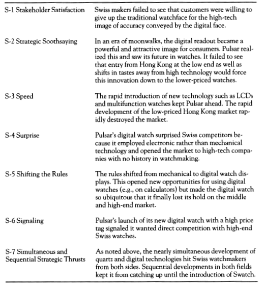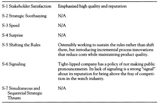 The watch industry illustrates the dynamic nature of the New 7-S’s, with firms seizing the initiative by improving their use of each of the New 7-S’s compared to the historical patterns of competitors. This industry (especially Rolex) also points out the vulnerabilities created by failing to use the New 7-S’s while attempting to sustain old advantages.