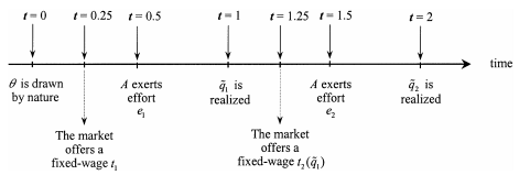 We assume that there is perfect competition between alternative principals to attract the agent in period 2. Moreover, a first important assumption of the model is that neither the manager nor the principals are informed of the ability of the manager. A second important assumption is that the principals cannot write contracts conditional on the production level. The idea here is that the production level is observable but not contractible. Accordingly, the first-period wage is a fixed wage t1 while the second-period (fixed) wage can depend on past observation t2(q1).