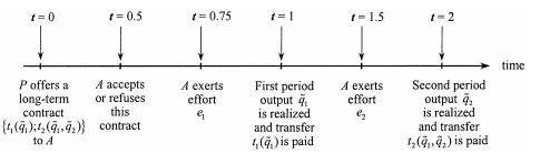 We will come back to the moral hazard framework of chapter 4. For now, we assume that the relationship between the principal and the agent is repeated for two periods. The risk-averse agent has an intertemporal utility given by