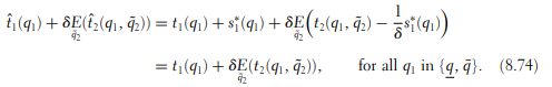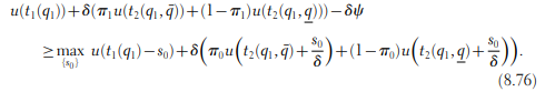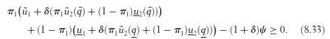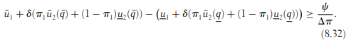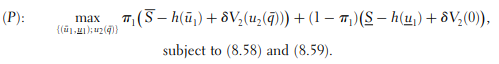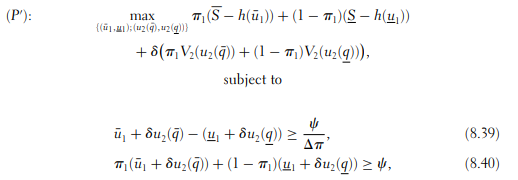 , because playing on future promises also helps to provide first-period incentives, as (8.40) has already shown us. However, diminishing u2(q) to its optimal value with no renegation on the contract conflicts with the second-period participation constraints (8.57). Indeed, using (8.55) and (8.56), we observe that the optimal long-term contract always violates the constraint (8.57), because ![]()