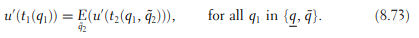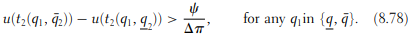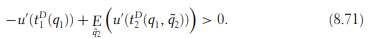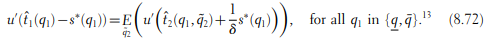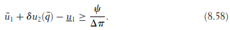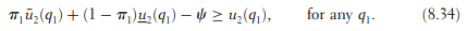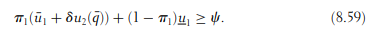 , because playing on future promises also helps to provide first-period incentives, as (8.40) has already shown us. However, diminishing u2(q) to its optimal value with no renegation on the contract conflicts with the second-period participation constraints (8.57). Indeed, using (8.55) and (8.56), we observe that the optimal long-term contract always violates the constraint (8.57), because ![]()