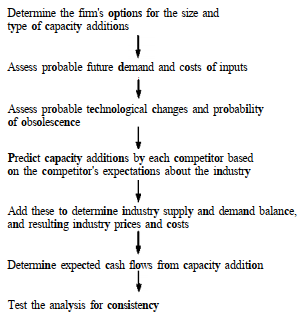 The steps in Figure 15-1 must be analyzed in an interactive fash-ion. The first step is to determine the realistic options available to the firm in adding capacity. Usually the size of the additions can vary, and the degree of vertical integration of the new capacity may be a variable as well. The addition of unintegrated capacity can be a hedge against risk. Since the firm‘s own decision about how much capacity to add can influence what its competitors do, each of its op–tions must be analyzed separately in conjunction with competitor behavior.