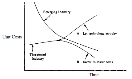 The propensity of the threatened industry to forego profits in pricing or aggressively investing in cost reduction to hold volume will be a direct function of the exit barriers (see Chapters 1 and 12) in the threatened industry. If they are high because of specialized as-sets, high perceived strategic importance, emotional ties, or other causes, then the emerging industry may well face determined and even desperate efforts by the threatened industry to stem its growth.