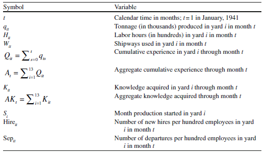 Our general approach was to estimate production functions in which output pro- duced in a given period depended on the inputs of labor, capital, organizational experience, and other variables. Variables used in our analysis of the shipyards data and the symbols used to designate them are listed in Table 3.2.