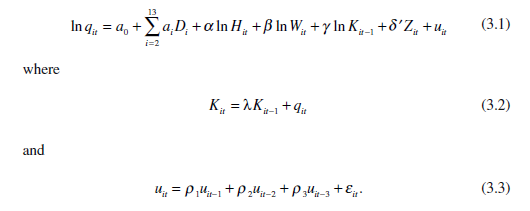Because our empirical analysis of knowledge depreciation is a new contribution, an explanation of how we measured depreciation is developed. Our approach to measuring depreciation is formalized in Eq. (3.2). Variable Kit is the stock of experi- ence accumulated by yard i at date t. Equation (3.2) allows for the possibility that the stock depreciates over time by including the parameter lambda, λ. Lambda is estimated through a scanning procedure for maximum likelihood estimation (Dhrymes, 1966; Goldfeld & Quandt, 1972). If λ is estimated to be one, the accu- mulated stock of knowledge is simply equal to lagged cumulative output, the classic measure of experience. If λ is estimated to be less than one, however, there is evi- dence of depreciation because output from the distant past receives less weight than recent output.