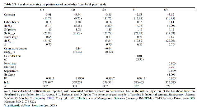 Our first empirical study of knowledge depreciation was based on data from the construction of the Liberty Ship during World War II (Fisher, 1949). We learned about these data from Rapping’s (1965) study, in which he found evidence of learn- ing in the shipyards. Rapping’s study provided particularly compelling evidence of learning because he controlled for important factors such as economies of scale and technological progress associated with the passage of time in his analysis. Rapping found significant evidence of learning when these important additional factors were taken into account.