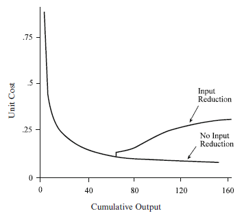 Fig. 3.1 The relationship between unit costs and cumulative output when inputs are reduced to half their initial levels. Note: Reprinted by permission from L. Argote,