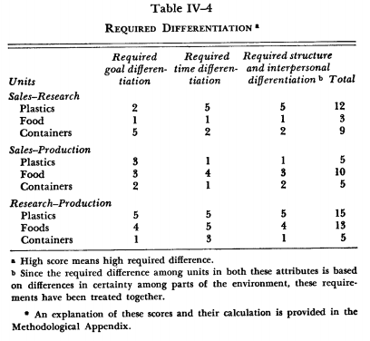 We have summarized the state of differentiation required by each environment in Table IV—4. 6 It seems quite apparent from these data that the container environment required less differentiation of organizational parts than either plastics or foods, while foods required less than plastics. We therefore predicted that the actual degree of differentiation found in organizations in these three industries would vary accordingly. We were also, of course, predicting that the high- performing organizations in each industry would more clearly meet the environmental requirements for differentiation than their less effective counterparts. Before we test these predictions, we shall turn to the other major environmental demand on organizations, the required degree of integration.