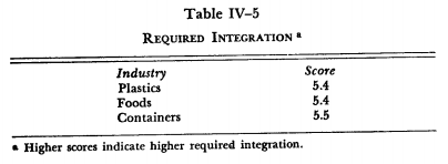 In our investigation of the plastics industry we found that organizations in this environment were required to achieve a high degree of integration. Implicitly, we were assuming that the requirement for integration in this industry might be higher than that in some other industries. The data collected from top executives in the food and container industries indicated, however, that the degree of integration required among different units was virtually the same in all three environments (Table IV-5).