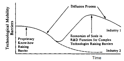 The rate of diffusion of proprietary technology will depend on the particular industry. The more complex the technology, the more specialized the required technical personnel, the greater the critical mass of research personnel required, or the greater the economies of scale in the research function, the slower proprietary technology will tend to diffuse. When heavy capital requirements and economies of scale in R&D confront imitators, proprietary technology can provide a lasting mobility barrier.