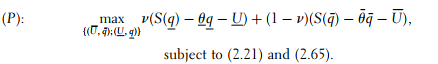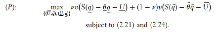 Inserting the values of U and U¯ that were obtained from the binding con- straints in (2.21) and (2.24) into the principal’s objective function and optimizing with respect to outputs leads to qSB = q∗, i.e., no distortion for the efficient type, just as in the case of risk neutrality and a downward distortion of the inefficient type’s output q¯SB < q¯* given by