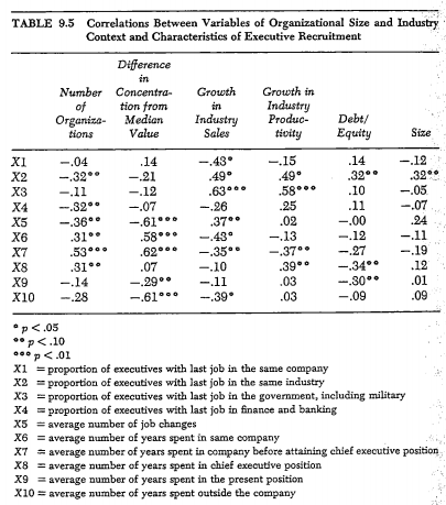 In Table 9.5, the correlations between measures of industry context and the characteristics of executive succession and recruitment are displayed. The examination of the results tends to support both the importance of context as an explanation for executive change and recruitment patterns and the relative importance of socialization and interfirm communication factors compared to variables such as firm size or financial structure.