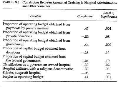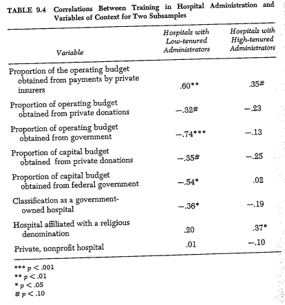 If our argument is correct, and hospitals also select administrators who can cope with critical contingencies, then we should find systematic relationships between the hospital’s context and the characteristics’1, of its chief administrator. Pfeffer and Salancik (1977) examined th relationship between the hospital administrator s formal training ffi, hospital administration and dimensions of the organizational conteste The relevant correlations are displayed in Table 9.3. Training in hosv pital administration was related, as expected, to the context of the funding sources. Hospital administrators tended to have more training to the extent that the organizations received insurance funds and less training when private donations were more important.