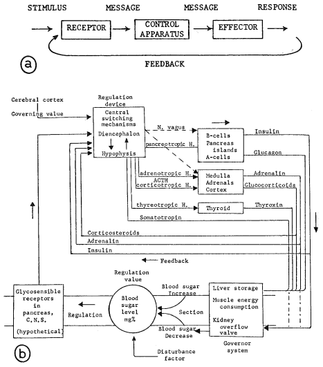Fig. 7 .2 . a: Simple feedback scheme, b : Homeostatic regulation of the blood sugar level. (After Mittelstaedt, 1954.)