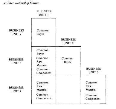 There are often many different interrelationships within a diversi fied firm. Different groups of business units are frequently related in different ways. One group of business units may be related by their markets, while a different, but partially overlapping, group of business units is related in production. The interrelationship matrix in Figure 10-1 illustrates one such pattern, where business units 1, 3, and 4 have a common component and common raw material, while business units 1, 2, and 3 have a common buyer.