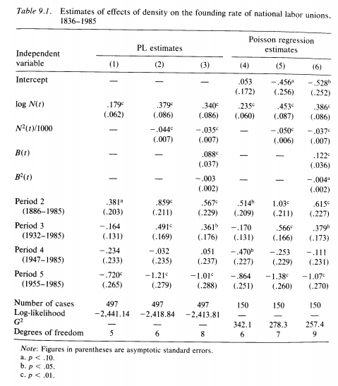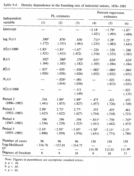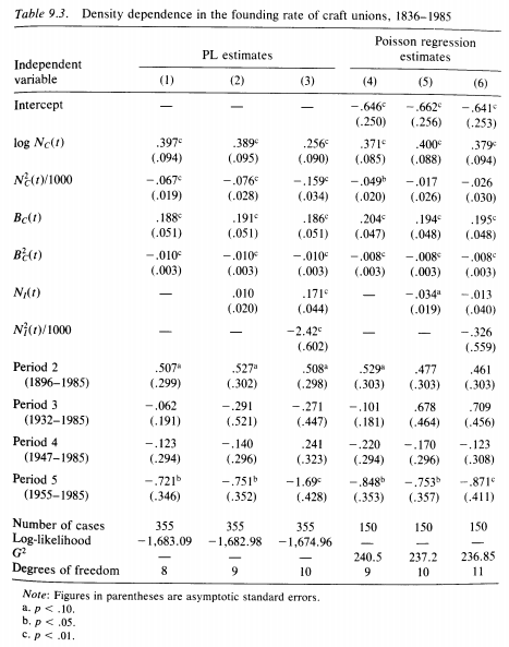 What happens when the cross-effect of density of industrial unions (Nt) is added to the model? Columns 2 and 5 in Table 9.3 give the answer. In this case, choice of estimator makes a difference, but it turns out that the difference is not substantively important. The PL estimates tell that Nt had a negligible effect on the craft founding rate. This estimated cross-effect is much smaller than its standard error. The ML estimates of Poisson regres- sions, however, indicate that the cross-effect is negative and significant. Thus the competitive effect between subpopulations was a strong one according to the Poisson regressions. The estimate in the fourth column implies that the founding rate of craft unions was negligible when there were 50 industrial unions (since exp(-.304*50) ≈ 0). Put differently, growth in the density of industrial unions from zero to its historical maximum eradicated the founding rate of craft unions, according to the Poisson regression estimate.