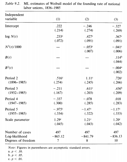 The results of estimating Weibull models with the same causal structure as the models in columns 3 and 6 in Table 9.1 appear in Table 9.2. Several features of these estimates are noteworthy. First, the Weibull model im- proves significantly over an exponential (time-independent) model with the same specification of the effects of the covariates. There does appear to be duration dependence in the founding process. The estimated scale parameter, σ, exceeds unity. Since σ = p-1 (see equation 8.12), pˆ = 1/1.2 = .83. This estimate of the Weibull parameter implies that the founding rate declines slowly with the passage of time since the previous founding. The less time that has elapsed since the last founding, the lower is the probability of a founding in the near future. Second, the estimates of density dependence and rate dependence are quite similar to those in Table 9.1. Adding explicit duration dependence does not alter substantive conclusions about these ecological processes.