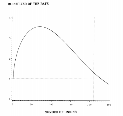 Because the estimated rate rises very sharply with increasing density in the range near N = 0, it is more informative to use the multiplier at some non-zero level of N as the point of comparison. For instance, take the level N = 5 as the baseline; then the multiplier is 1.73 higher than the rate at N = 0. So a value of 1.73 becomes the baseline for comparison here. When density increases to the historical maximum N = 211, the multiplier equals 1.30. In other words, our estimates imply that the founding rate in popula- tions with 5 national unions was higher than that in a population of 211 unions, since 1.73 is larger than 1.30. Put differently, the founding rate when there were only 5 unions was 33 percent larger than it was at the historical high of density. These comparisons, which hold exactly for the first period and no foundings in the prior year, show that density drives the founding rate in a large population down to the level that holds in a very small population of unions. The rate rises sharply with increasing density in the lower range and drops sharply with increasing density in the higher range, indicating that the founding rate is very sensitive to density.