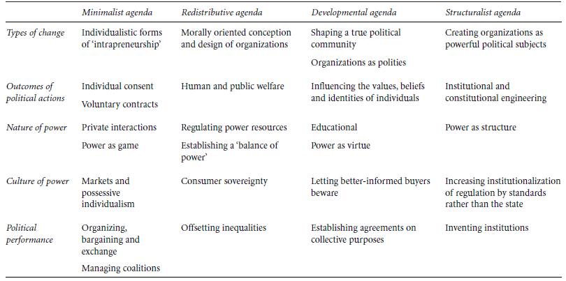 The importance of the macro-political developments and their likely effect on the futures of power in organizations is that the futures of power will be largely depen- dent on the magnitude of the changes that are affecting and will affect the orga- nizational world over the next few decades. In this book we have constantly put forward the socio-historical dimension of the genesis and of the dynamics of power as a concept and as a sociological and political condition of everybody’s life in contemporary organizations. Put differently, whether the agenda for change will be minimalist, redistributive, developmental or even structuralist, to take March and Olsen’s four (1995) conceptions of the political agenda at the level of societies, the nature and culture of power will be durably affected. Minimalist power is rela- tively indifferent to substantive outcomes and the construction of identities; it is more used to minimize the costs of political battles. Redistributive power is used to limit inequalities in both the polity and the power of the elite. Developmental power is used to generate shared cultures and educate the people in so far as it con- stitutes a political community. Structural power is used in the engineering of spe- cific institutions aiming to shape and control the demands of the polity (1995: 242–5). In Table 13.1 we sketch what this might imply for the concept and use of power.