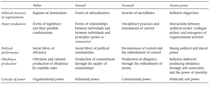 We can also draw from the works of four major figures of this book, Weber, Simmel, Durkheim, and Foucault, not only to highlight different perspectives, which has already been done in the previous chapters, but to envisage a possible combination of their views to think through the conceptual futures of power, as shown in Table 13.2. Given the stakes of the present period and the analysis that we have made of them, it goes without saying that we argue that organization studies should not merely shift from an efficiency-oriented perspective to one that is explicitly politically oriented. To comply with a managerial directive is to accede to a moral or political agenda that one does not necessarily share. The role of political power is to invent and engineer powerful institutions that create the necessary obedience-generative constraints and legitimacies inside organizations and societies. One of the most pressing questions posed by a perspective based on a political agenda is that of moral disagreement. The dispersion of individuals and values around the globe in the present context of global ‘organizational sprawling’ emphasizes the discrepancies between decisions made in some circles of power and the perceptions and interpretations of individuals; put another way, the question of how to manage the common affairs of people who dis- agree about moral and non-moral matters but live together in the same society/orga- nization should be stressed. The urgent research question posed by the current growingly important ‘social agenda’ of organizations involves a series of topics. What will be the ways of binding the changing political commitment of individuals to new demands of power and of political communities in organizations that both colonize an increasing amount of their lifeworld and offer a diminishing sense of security? What will be the power of moral ‘things’ in the design of political structures and in the production of political leaders for organizations in the future? What will be the new balance between directive and soft power? How will organizations act as increas- ingly political subjects in a world where the changing relations between states and markets increasingly empower non-state actors and disempower individual con- sumers bewildered by the confusions of alleged choice?