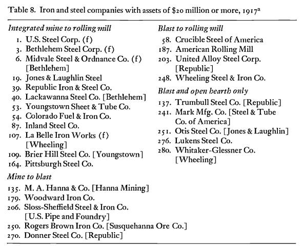 By 1917 the American iron and steel industry had acquired its modern look. Its major branches had become concentrated, and the same firms would long continue to be its leaders.25 Of the 13 largest iron and steel companies in 1967, all but 1 was in operation in 1917 . Of those 12, 8 were already among the 10 largest in the industry in 1917 . The other 2 of the top 10 in that year—Midvale and Lackawanna—became part of Bethlehem in 1922 . The only new company to appear by the 1970s was National —a merger of 3 firms, 2 of which already existed in 1917 . As the table indicates, after 1917 the large steel firms grew by merger, and such mergers increased the extent of integration within the industry. By the 1930s nearly all the large firms came to coordinate the flow of materials from the mines through the rolling mill, but not further into fabrication.