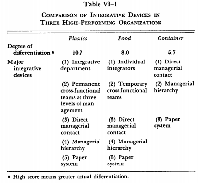 Each of these high-performing organizations used a different combination of devices for achieving integration. As the reader will recall, the plastics organization had established a special department, one of whose primary activities was the integration of effort among the basic functional units (Table VI-1). In addition, this organization had an elaborate set of permanent integrating teams, each made up of members from the various functional units and the integrating department. The purpose of these teams was to provide a formal setting in which interdepartmental conflicts could be resolved and decisions reached. Finally, this organization also placed a great deal of reliance on direct contact among managers at all levels, whether or not they were on a formal team, as a further means of reaching joint decisions. As Table VI-1 suggests, this organization, the most highly differentiated of the three high performers, had the most elaborate set of formal mechanisms for achieving integration and in addition also relied heavily on direct contact between managers.