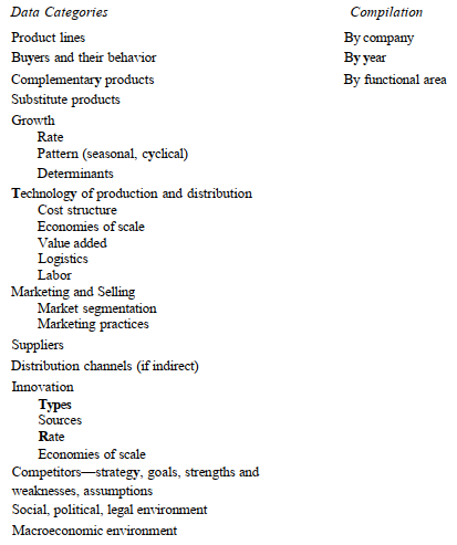 How should one go about analyzing an industry and competi–tors? What types of data does one look for and how can they be or-ganized? Where does one look for these data? This appendix deals with these questions and some of the other practical problems in-volved in conducting an industry analysis. There are basically two types of data about industries: published data and those gathered from interviews with industry participants and observers (field data). The bulk of discussion in this appendix will center on identify–ing the important sources of published and field data, their strengths and weaknesses, and strategies for approaching them most effective-ly and in the right sequence.