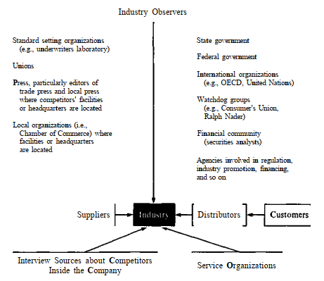 In gathering field data it is important to have a framework for identifying possible sources, determining what their attitude toward cooperation with the research is likely to be, and developing an ap-proach to them. Figure B-2 gives a schematic diagram of the most important sources of field data, which are participants in the industry itself, firms and individuals in adjacent businesses to the industry (suppliers, distributors, customers), service organizations that have contact with the industry (including trade associations), and industry observers (including the financial community, regulators, etc.). Each of these sources has somewhat differing characteristics, which are useful to identify explicitly.