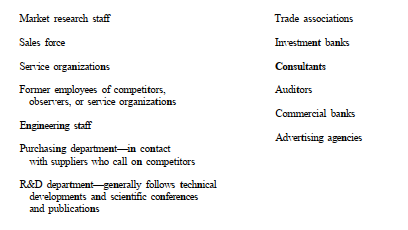 The next most sensitive sources are service organizations, such as consultants, auditors, bankers, and trade association personnel, who operate under a tradition of confidentiality about individual clients, though usually not about general industry background infor-mation. Most of the other sources are not threatened directly by in-dustry research, and in fact they often perceive it as a help. The most perceptive outside observers of the industry are often suppliers’ or customers’ executives who have taken an active interest in the whole range of industry participants over a long period of time. Retailers and wholesalers are often excellent sources as well.