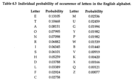 When utilized in a real message the information content of a letter is still lower, as the English language inherently restricts the freedom of choice. Constraints induced by grouping and patterning of letters, words and compulsory redundancy cause the real information content to be a little less than 2 bits per letter. The probabilities of occurrence of certain pairs, triplets, etc. of letters are astonishingly constant, just as are the frequencies of various words. The individual probability of words and letters seems to have a correlation to their costs in time and effort when used; the total average cost in a message is generally minimized. The probability of occurrence for individual letters in the English alphabet is presented in Table 4.3.