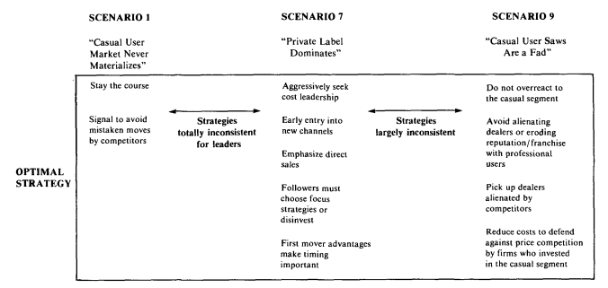A strategy built around one scenario is risky, while a strategy designed to ensure success under all scenarios is expensive. Moreover, the strategies implied by the different scenarios are often contradictory. For example, developing nondealer channels for chain saws will run a high risk of alienating dealers, and it is hard to pursue nondealers and dealers at the same time. In such circumstances, positioning for several scenarios may leave the firm “ stuck in the middle” with no competitive advantage, a blurred brand image, and a suboptimal orga nizational structure (see Chapter 1). The inconsistency of implied strategies under different scenarios often raises a serious strategic di lemma. In chain saws, preparing for all three scenarios would clearly lead to suboptimization, and thus chain saw competitors will have to resolve some difficult tradeoffs before selecting their strategies. One of the important functions of scenarios is to reveal elements of strategy for which a firm must make such choices.