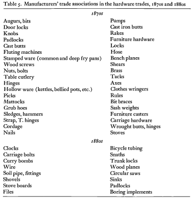 By the 1880s these federations had become part of the normal way of doing business in most American industries. Trade associations for the purpose of controlling price and production had appeared in the mechani- cal industries, including those making lumber, woodware, flooring, furni- ture, even caskets, and those producing shoes, saddlery, and other leather products. They came, too, in the refining and other chemically oriented industries—those producing petroleum, rubber footwear, explosives, glass, paper, and leather; and in the foundry and furnace industries—those making iron, steel, copper, brass, lead, and other metals. In addition, they occurred in industries fabricating metals into bars, wire, rails, nails, sheets, and all types of metal implements and machines. In the hardware indus- tries alone, over fifty different trade associations managed cartels for as many specialized products (see table 5).3 No industry appears to have been immune. Only in textiles, apparel, publishing, and printing were the number of trade associations small.