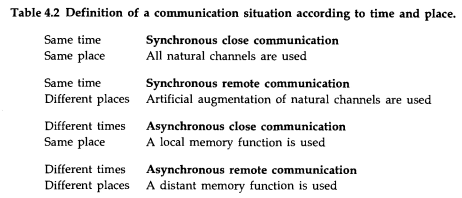 In reality, time and place influence all other parameters of a commu- nication situation. If these concepts are combined, an arrangement like Table 4.2 can be created and some different situations of communication defined. From the table with its comments it is possible to see how environmental factors and needs determine choice of and design features of the communication channel. Note that the use of solely natural channels severely restricts the general communication concept.