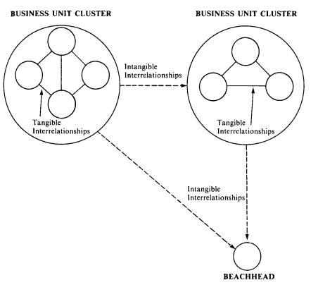 Diversification based on intangible interrelationships should be viewed not only as a stand-alone opportunity, however, but also as a potential beachhead. Once a firm enters a new industry based on intangible interrelationships, it can then use this beachhead to spawn new opportunities for diversification based on tangible interrelation ships. A good example is Procter & Gam ble’s initial acquisition of Charmin Paper Company, a beachhead which allowed Procter & Gam ble to build the highly interrelated cluster of paper products business units described earlier. Figure 10-2 illustrates schematically the process of diversifying through beachheads. An intangible interrelationship with the original cluster of tangibly related business units becomes the foundation for a new cluster. The diversified firm emerges as a number of clusters of business units related by tangible interrelation ships, with the clusters related by intangible interrelationships. A key test of diversification opportunities based on intangible interrelation ships, therefore, is their potential as a beachhead.